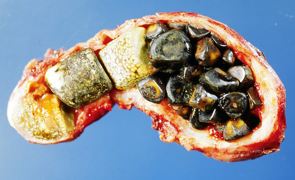 Cholesterol stones vary in color from light yellow to dark green or brown and are oval 2 to 3 cm in length often having a tiny dark central spot.The cholesterol stones are formed when bile contains too much cholesterol, bilirubin, or not enough bile salts, or when the gallbladder does not empty completely or often enough due to constipation or other reasons.