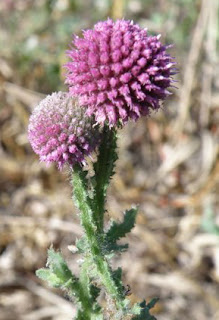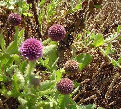 East Indian globe thistle is a much branched, strongly-scented annual herb with winged stem and the wings toothed. Alternately arranged obovate-oblong leaves are narrowed at the base, dentate and serrate, 1-3 cm long. Flowers occur in purple spherical heads, 8-15 mm, consisting of numerous tiny flowers. Flowers are purple and the stamens pale-purple. Flowering: October-January.