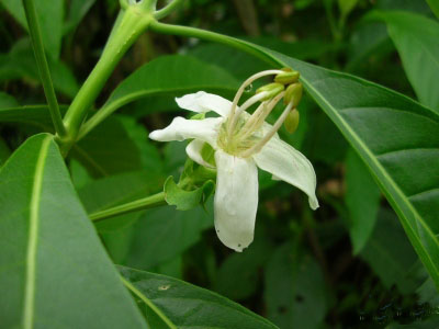 The wood of the stem is soft, and makes a great charcoal for gunpowder. The flower has large, attractive, white petals, streaked with purple on the lower lip. The fruit is a small capsule with 4 seeds.